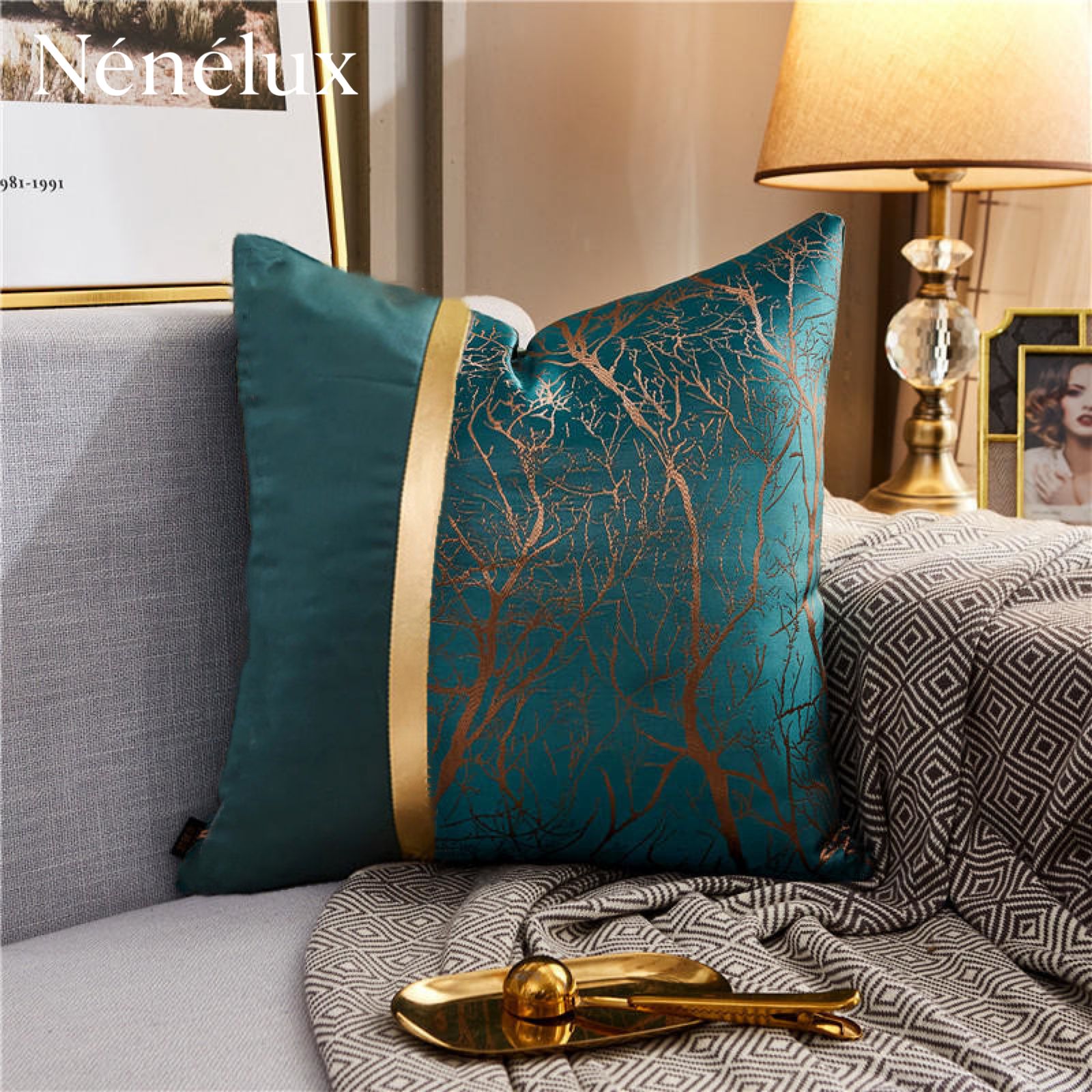 The Forest Horizon Cushion Covers embody depth and mystery. A rich teal base highlights copper-gold tree-branch motifs that shimmer under different light angles, while the vertical golden band adds definition and luxury. Together, these details create a sense of opulence reminiscent of twilight forests touched by sunset light.